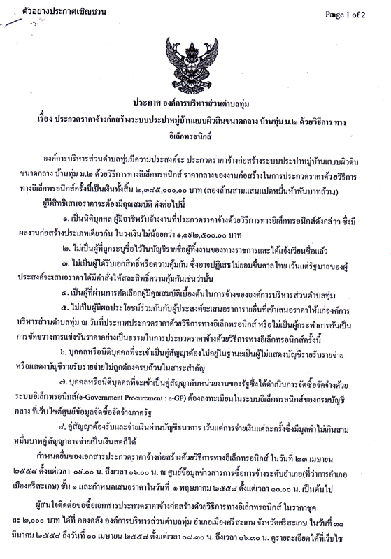 ประกาศเรื่อง การประกวดราคาจ้างก่อสร้างระบบประปาหมู่บ้านแบบผิวดินขนาดกลาง บ้านทุ่ม หมู่ 2 ด้วยวิธีการทาง อิเล็กทรอนิกส์