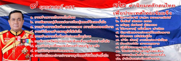 ตามที่จังหวัดได้ขอความร่วมมือในการจัดทำป้ายประชาสัมพันธ์แนวทาง 9 ยุทธศาสตร์ 12 ประเด็นปัญหา โดยต้องนำแนวคิดเศรษฐกิจพอเพียงมาใช้ และมีการพัฒนาแบบองค์รวม สร้างความสมดุลในด้านคน เศรษฐกิจ และสิ่งแวดล้อม ซึ่ง คสช. กำหนดไว้ในแผนพัฒนาเศรษฐกิจและสังคมแห่งชาติ ฉบับที่ 11 คือ สังคมจะต้องอยู่ร่วมกันอย่างมีความสุข เสมอภาค เป็นธรรม