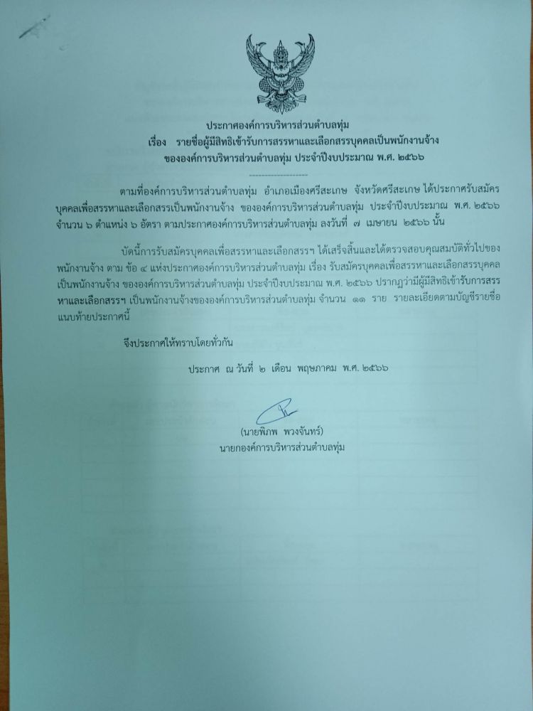ชื่อเรื่อง : ประกาศรายชื่อผู้มีสิทธิ์เข้ารับการสรรหาและเลือกสรรบุคคลเป็นพนักงานจ้างของ อบต.ทุ่ม ประจำปี พ.ศ. 2566
