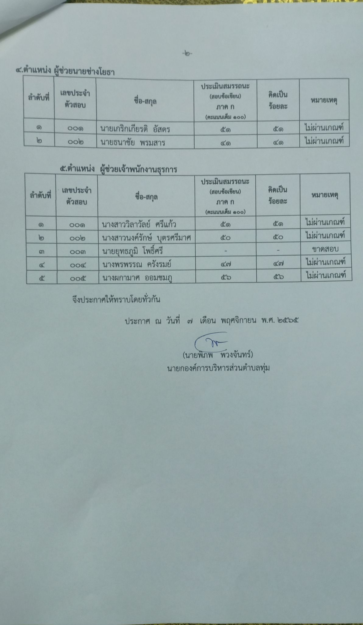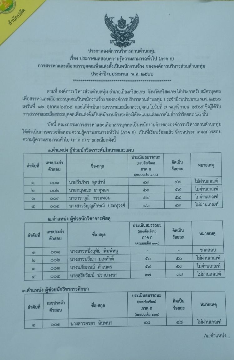 ชื่อเรื่อง : ประกาศผลสอบความรู้ความสามารถทั่วไป (ภาค ก ) การสรรหาและเลือกสรรบุคคลเพื่อแต่งตั้งเป็นพนักงานจ้าง ขององค์การบริหารส่วนตำบลทุ่ม ประจำปีงบประมาณ 2566