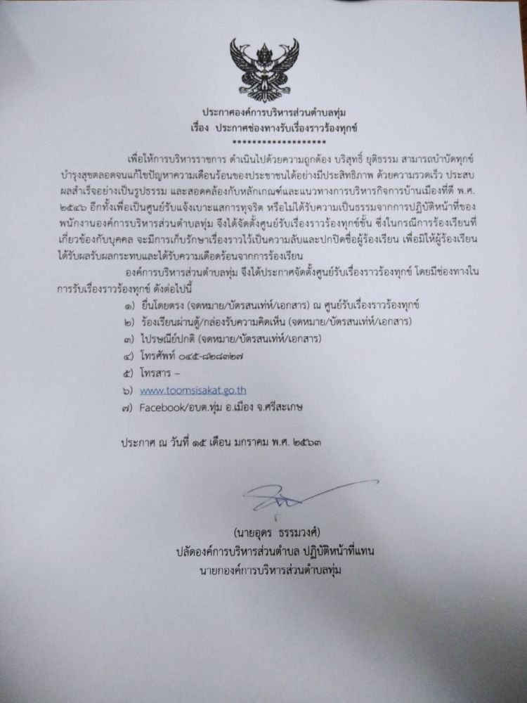 ชื่อเรื่อง : ประกาศช่องทางรับเรื่องร้องทุกข์
