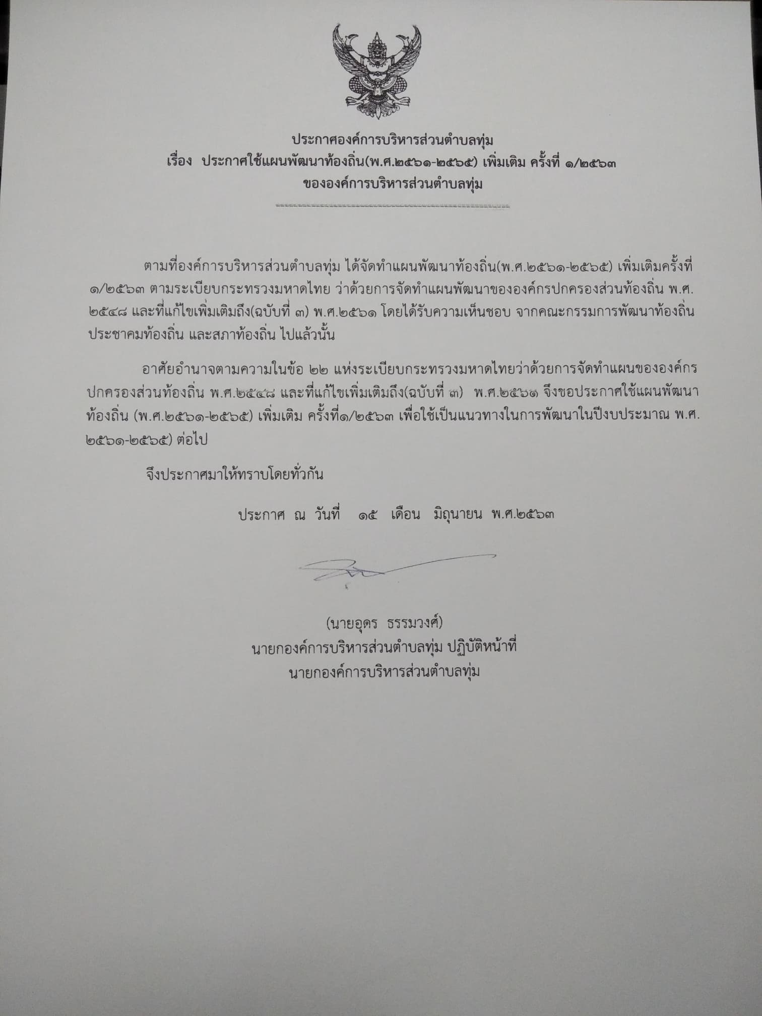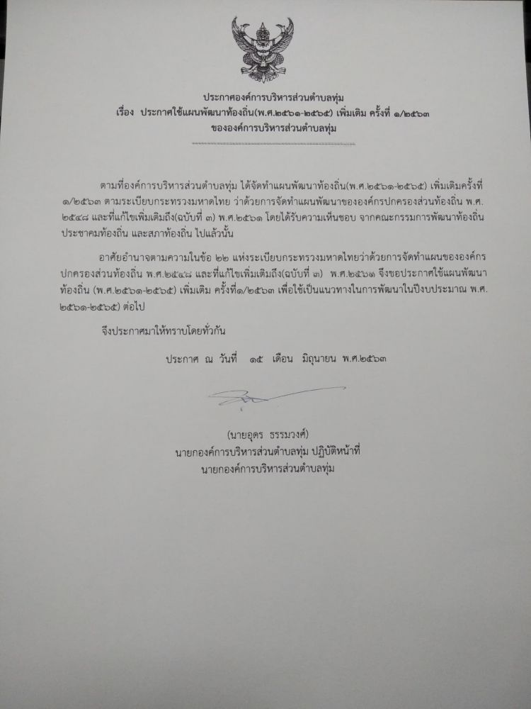 ประกาศใช้แผนพัฒนาท้องถิ่น (พ.ศ.2561-2565)เพิ่มเติม ครั้งที่1/ 2563