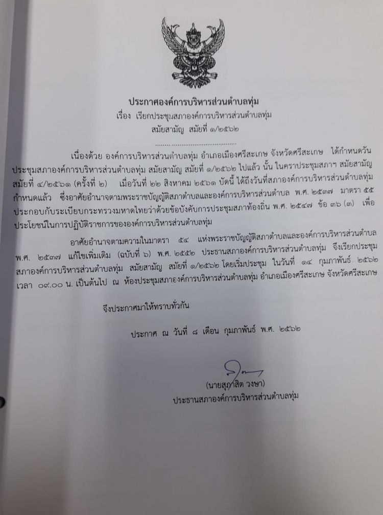 ประกาศองค์การบริหารส่วนตำบลทุ่ม เรื่องเรียกประชุมสภาองค์การบริหารส่วนตำบลทุ่ม สมัยสามัญ สมัยที่1/2562