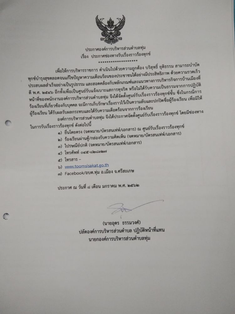 ชื่อเรื่อง : ประกาศช่องทางรับเรื่องราวร้องทุกข์