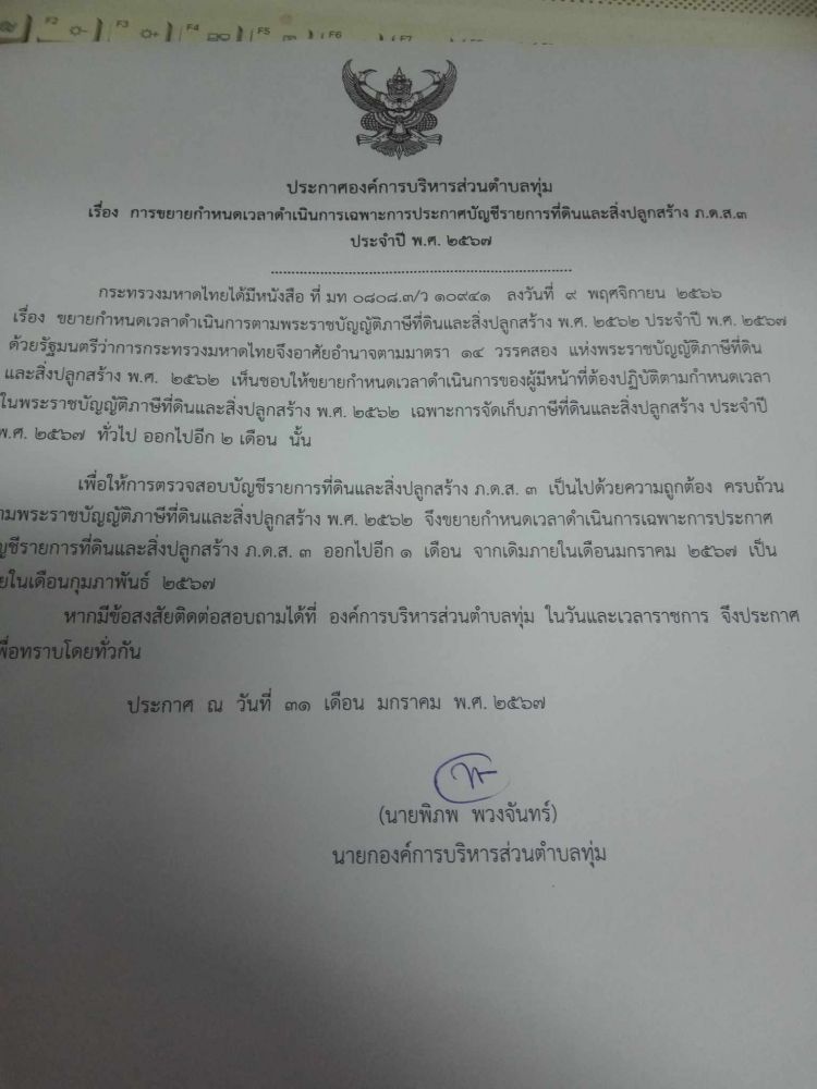ชื่อเรื่อง : ประกาศการขยายกำหนดเวลาดำเนินการเฉพาะการประกาศบัญชีรายการที่ดินและสิ่งปลูกสร้าง ภ.ด.ส.3 ประจำปี พ.ศ. 2567